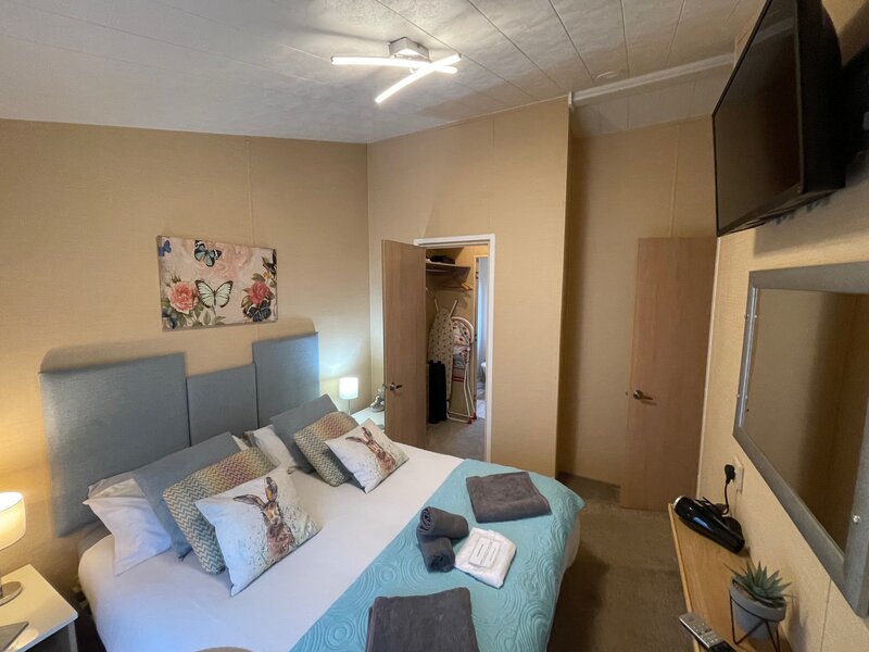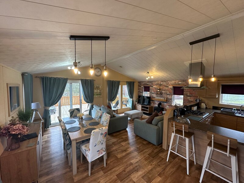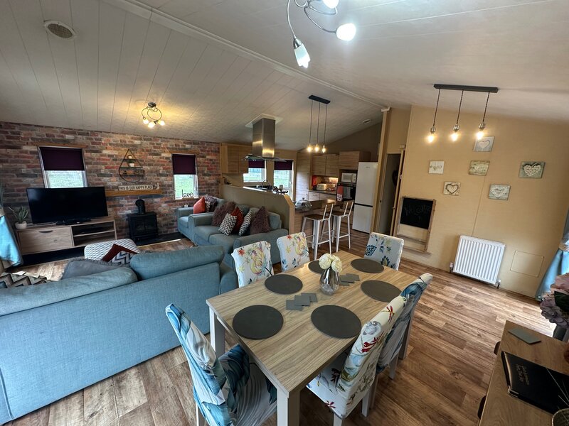 This luxury lakeside lodge is a double sided open plan lodge, with free standing large sofas, electric fire, patio doors leading onto large south facing veranda, with open plan kitchen with gas hob, Integral dishwasher , washing machine, electric cooker, breakfast bar with two stools, large dining table with 6 seats, the large family bathroom has a bath with over head shower, toilet and W.C, radiator, the master bedroom has a kingsize bed with wall mounted tv, walk in wardrobe with high chair and travel cot, en-suite with large Shower , toilet and W.C, the further two bedrooms both have two full size single beds with fitted wardrobes and wall mounted TV/ DVD player