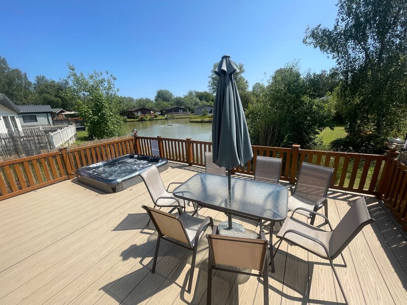 The luxury lakeside lodge L1 has a large wrap around veranda with a large square sunken hot tub, fairy lights and spot lights which lights up beautiful on an evening, outside dining table and 8 chairs with privacy bamboo, this is on a large corner south facing plot close to the complex, the small peaceful feature lake is prime location, there is a brick bbq for your use which off the decking