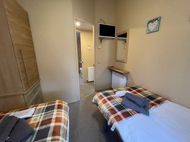 The lodge has one kingsize bed with walk in wardrobe with en suite WC also large shower, 2 further bedrooms with full size single beds in each room, the sofa bed can sleep 2 addional guests ( please note this is only with prior arrangement and a supplement of £25 per person)