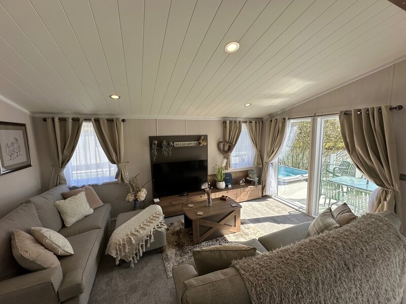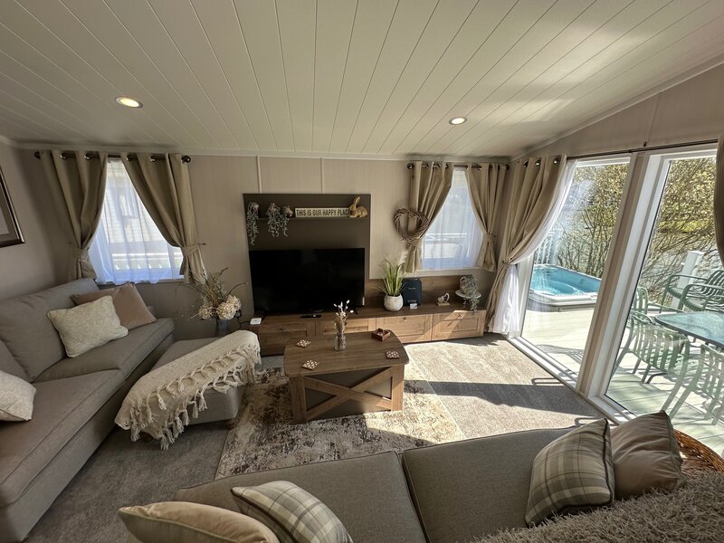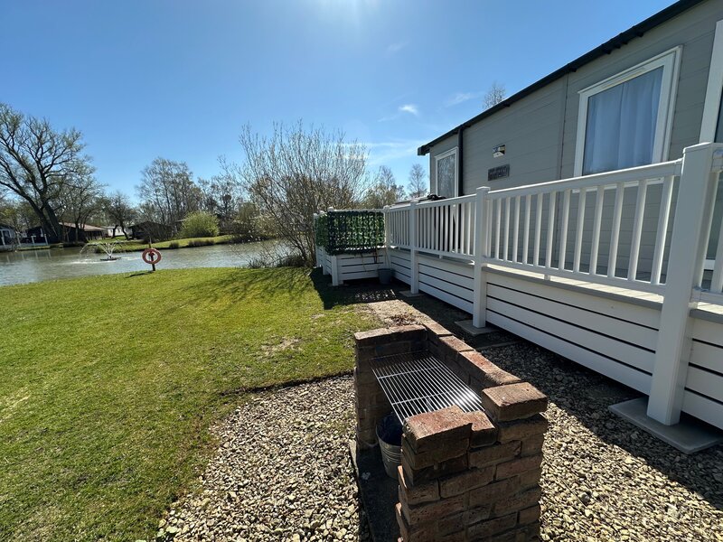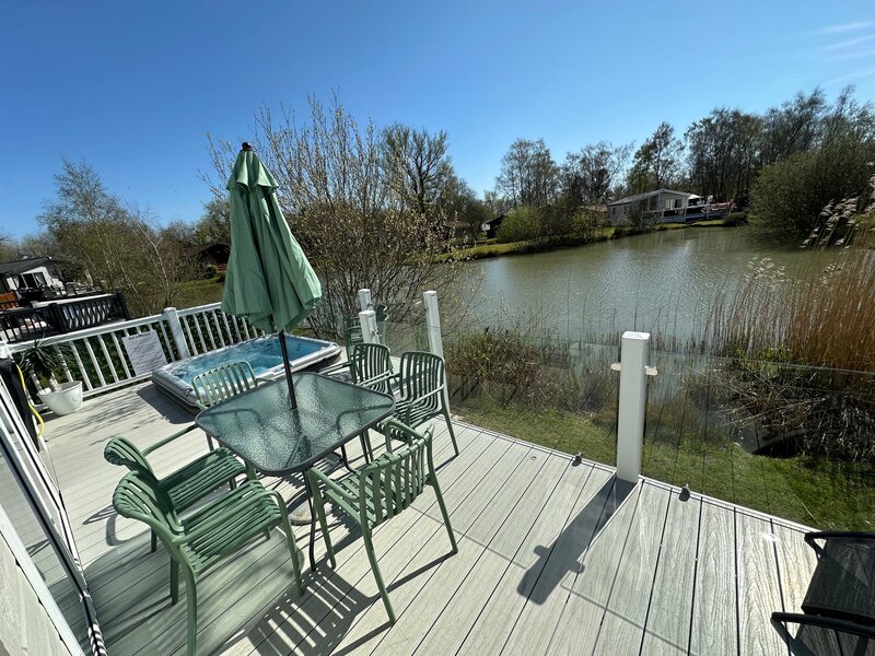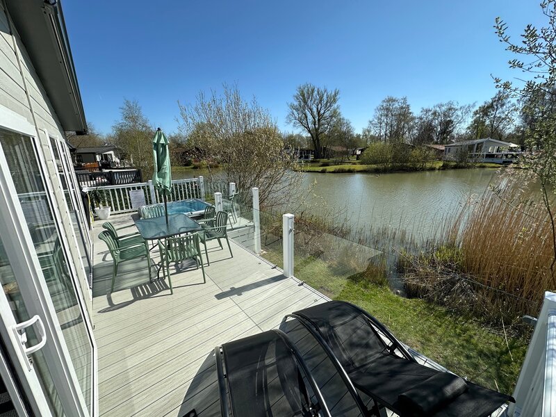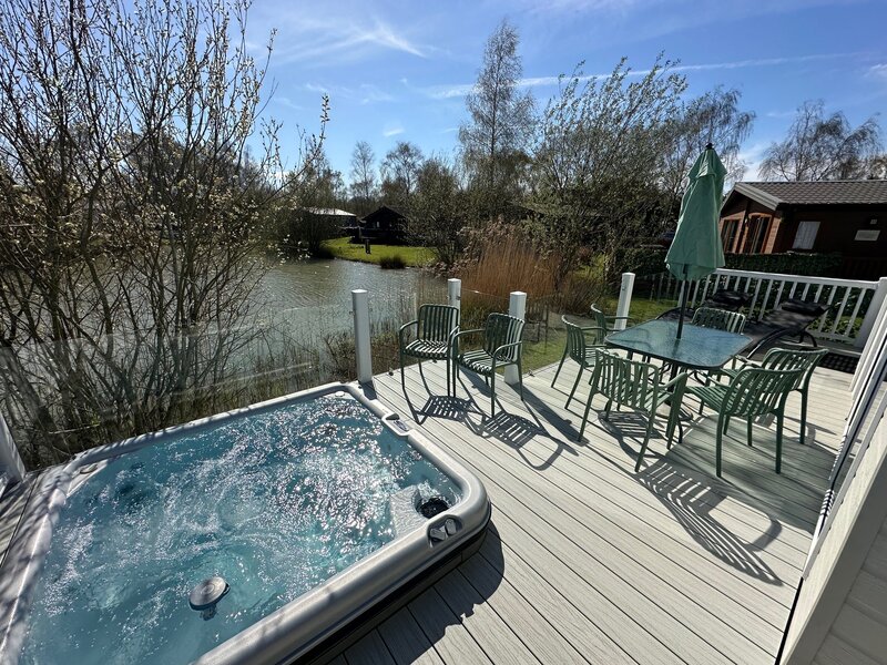 This lodge is on a large south facing plot next door to the luxury lakeside lodge L1, with a large full wrap around veranda , outside dining table and 6 chairs, large sunken hot tub with fairy lights, privacy bamboo and brick bbq for your use