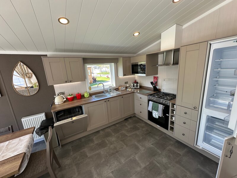 Luxury Lakeside Lodge L2 is a beautiful spacious open plan double sided 41×20 lodge which is situated on a peaceful feature lake Bull Rush and also side by side to my Luxury Lakeside Lodge L1, prime location with only a 2 min walk to the main amenities, the open plan living area is warm and cozy with two large sofas ones being a sofa bed, electric fire with wall mounted tv , games console with games, this has a fully equipped kitchen, gas oven, washing machine and dishwasher, breakfast bar with two stools, 3 bedrooms sleeping 6 guests, the master leading to the en suite with a shower, a family bathroom with a bath and shower, the open plan living area boasts a large kitchen with a washing machine, dishwasher, breakfast bar with bar stools, large family dining table and 6 chairs , the sliding patio door