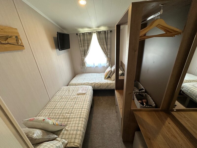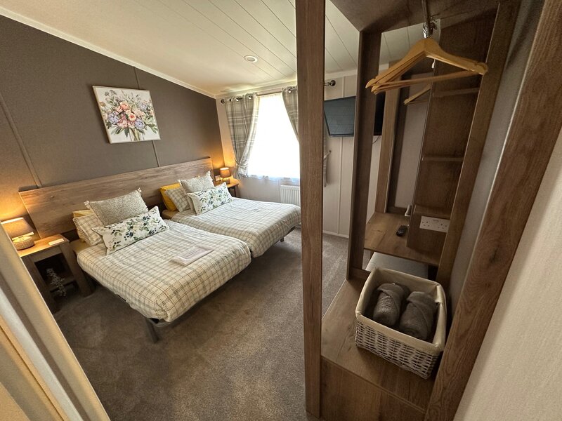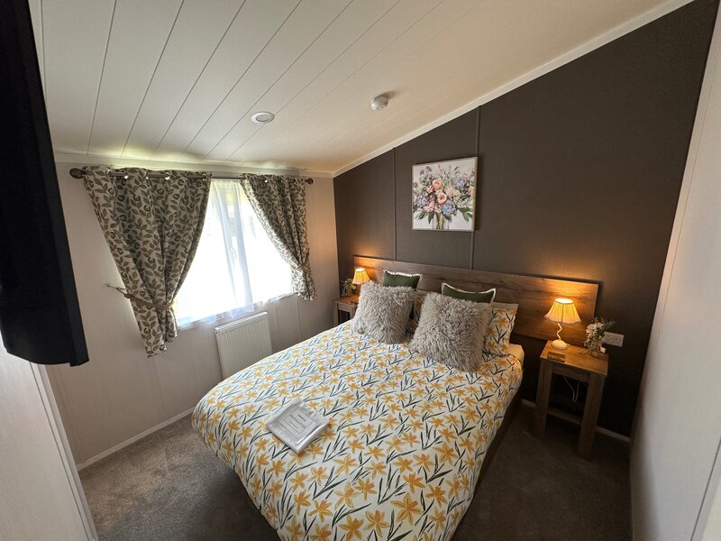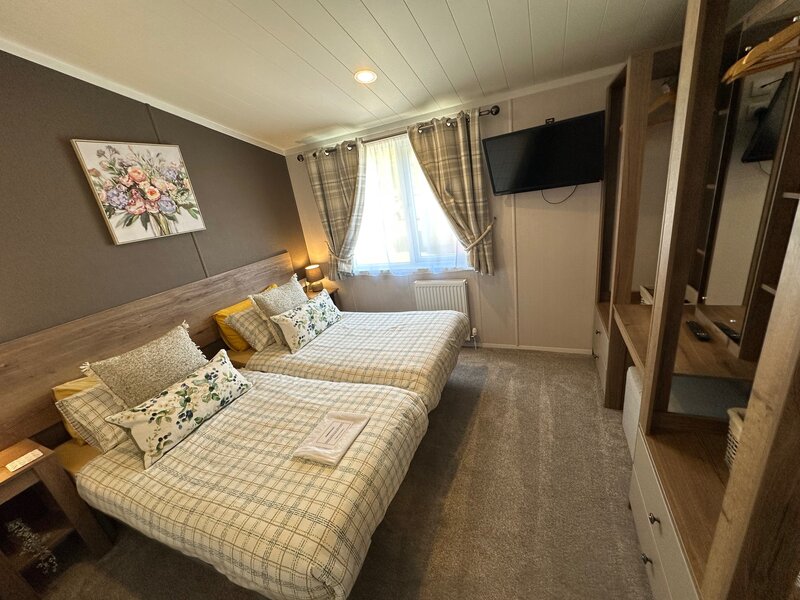 The Luxury lakeside lodge L2 sleeps 6 guests, with 3 large bedrooms, with two bedrooms having a kingsize bed with wall mounted tv, the third bedroom having two full size single beds and tv, there is a sofa bed in the living area that can sleep sleep 2 guests this is extra cost