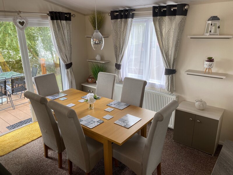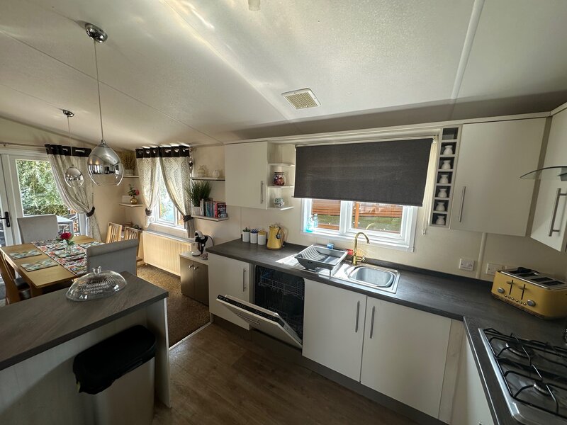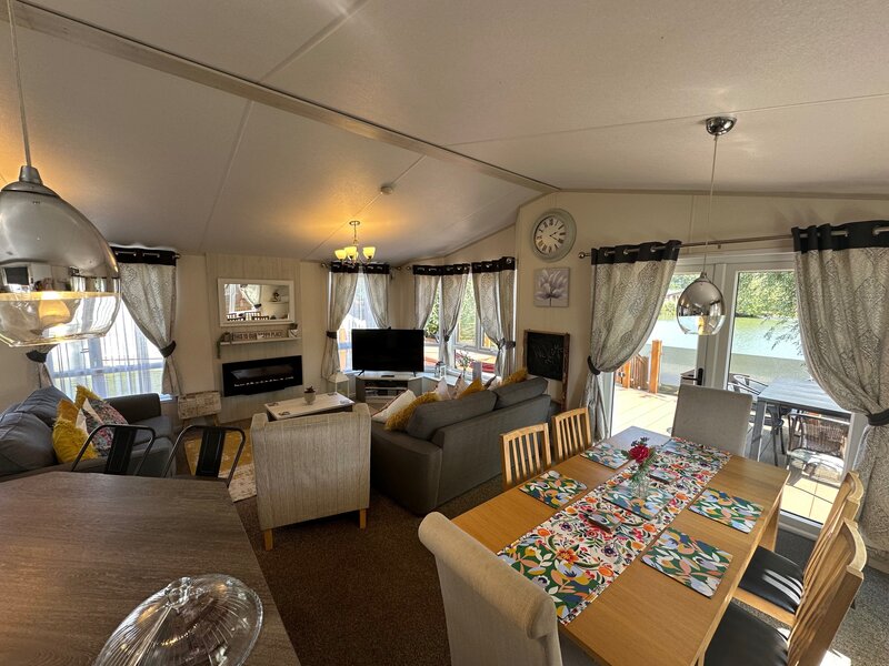 The lodge is open plan living area with fully equipped kitchen, table and 6 chairs, breakfast bar with 2 seats, full size fridge and freezer , cooker and grill, along with dishwasher, the living area has two large sofas one being a sofa bed and one arm chair with a floor space of 40ft x 20ft, smart tv and unit with games console along with a wall mounted fire place, off the hallway there is three bedrooms with TV in all rooms, 2 family bathrooms with a bath and showers plus an additional utility with washing machine extra toilet and W.C