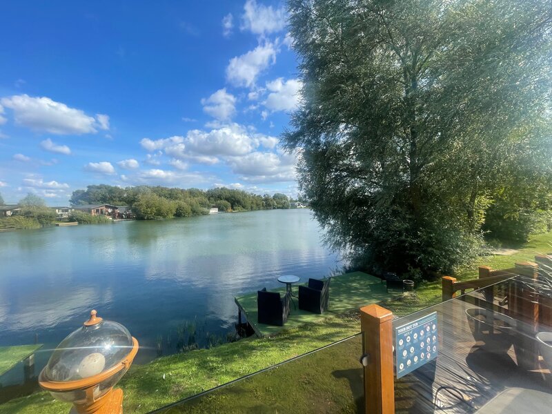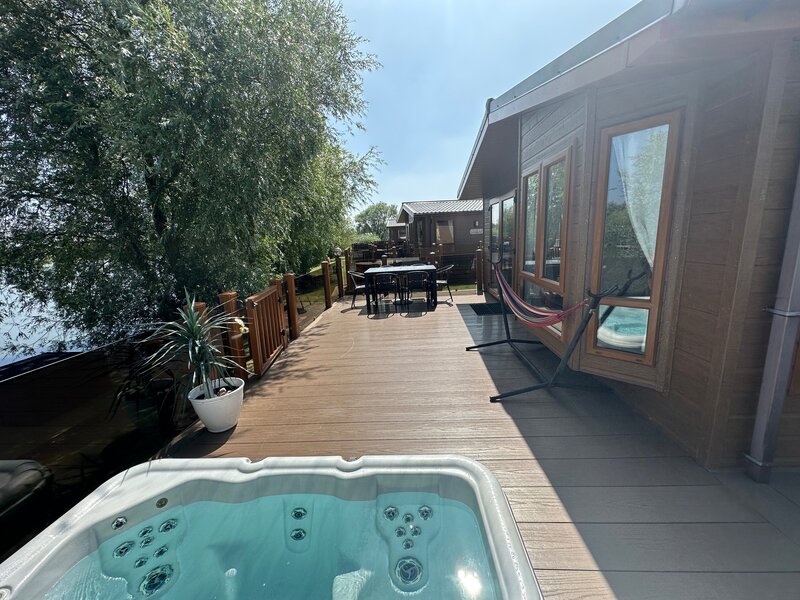 The patio doors open onto your own private Large veranda , huge square hot tub, the veranda has spotlights and lanterns, outdoor heating for 6 guests , this is secure with gates and steps leading to your own large private fishing peg and free fishing on the private fishing lake, with outstanding views